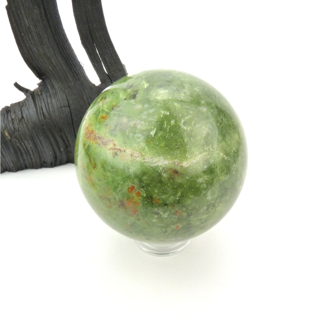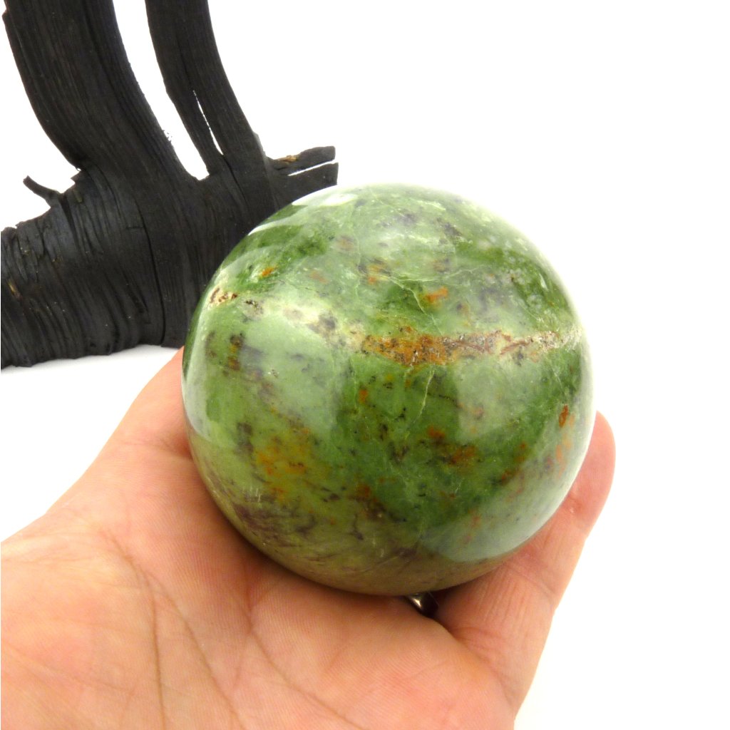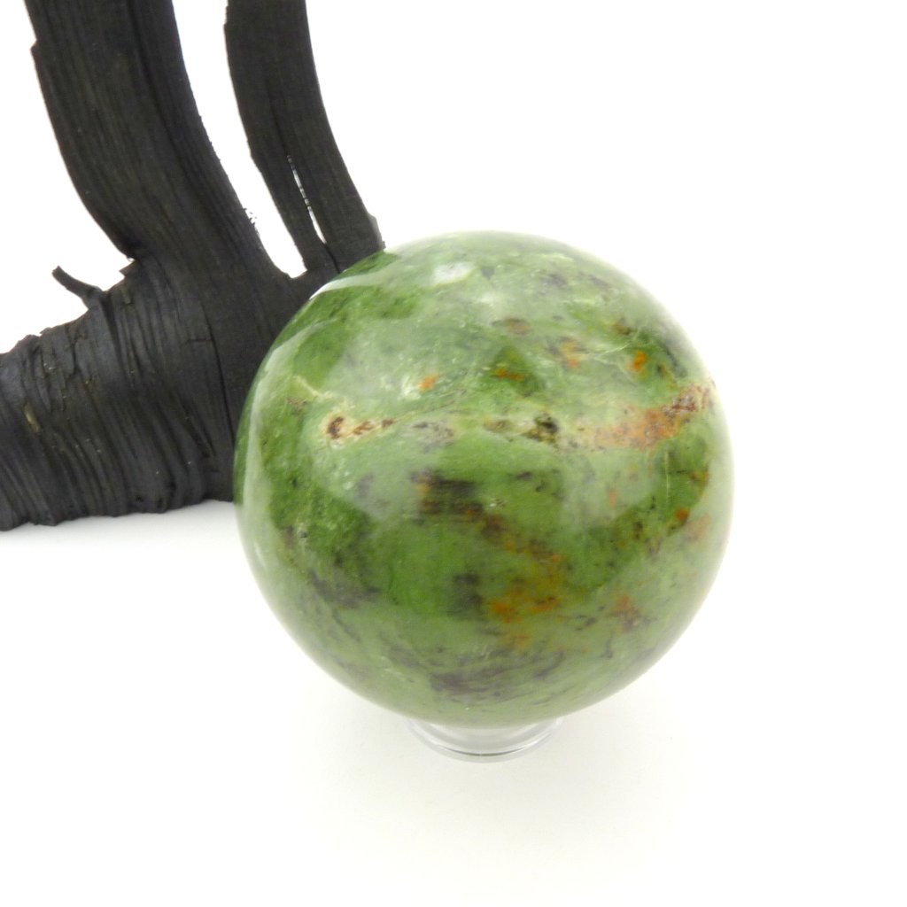 Chryzopras vybroušený do tvaru koule, kámen je leštěný.