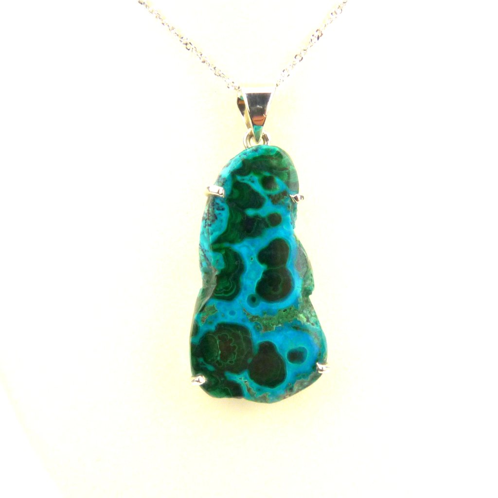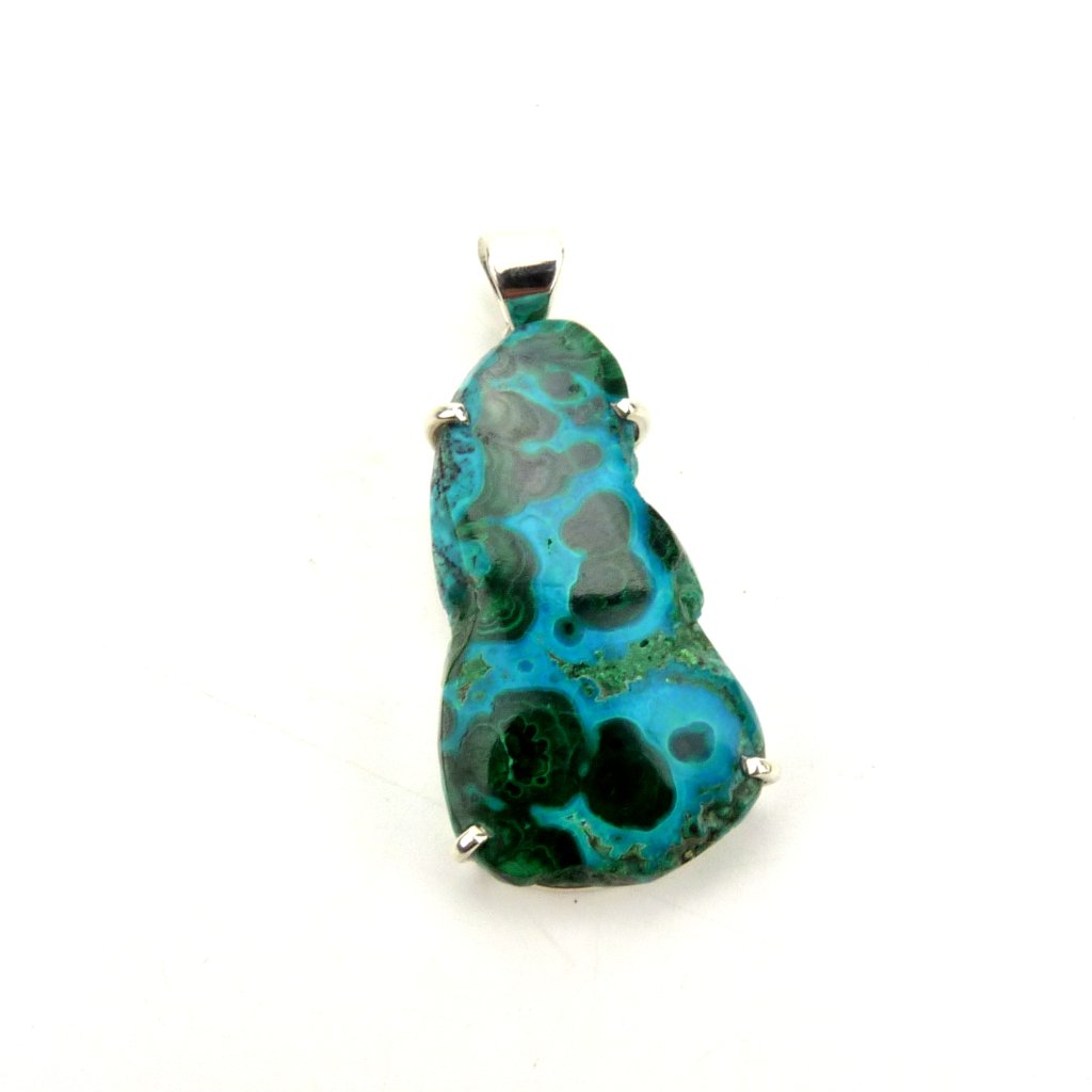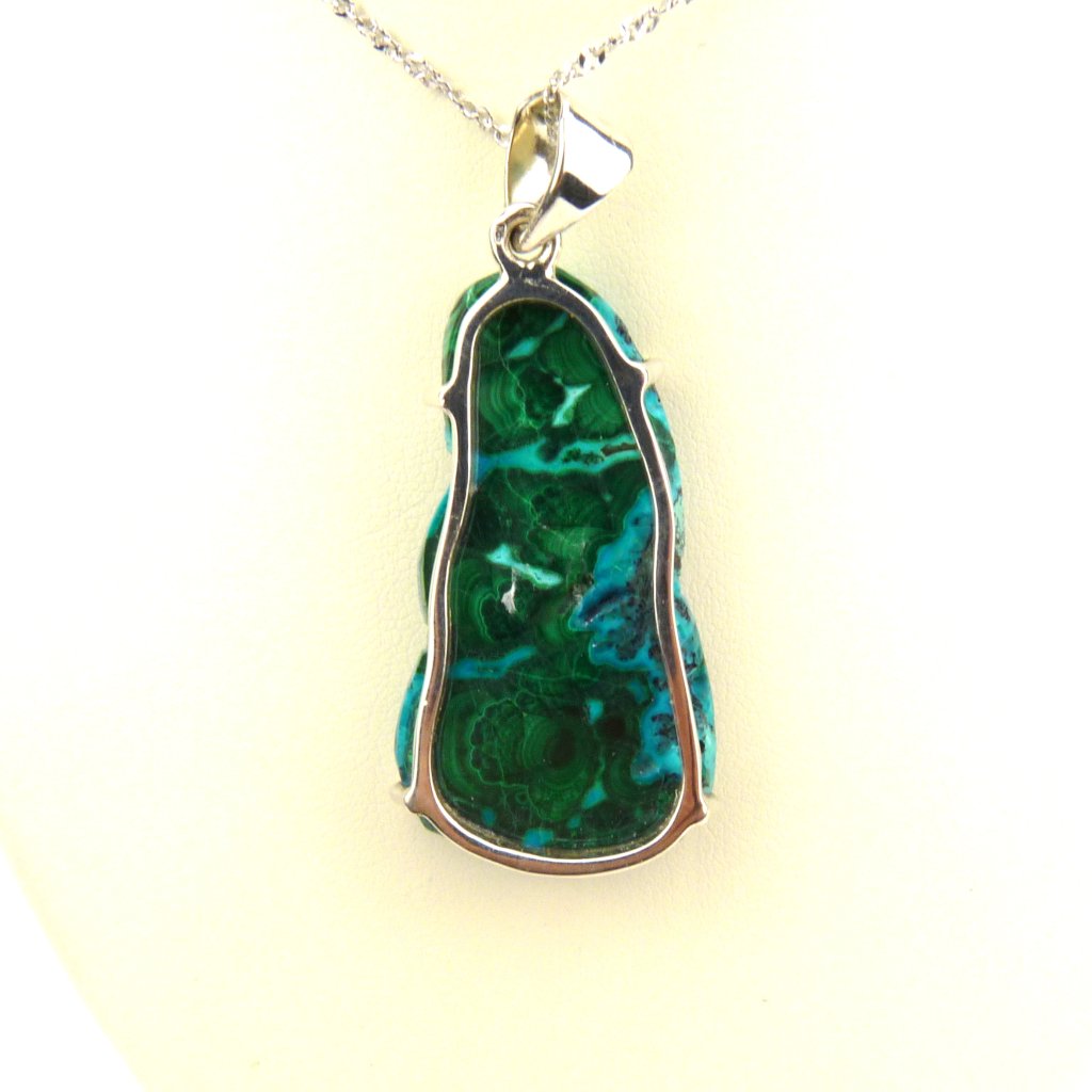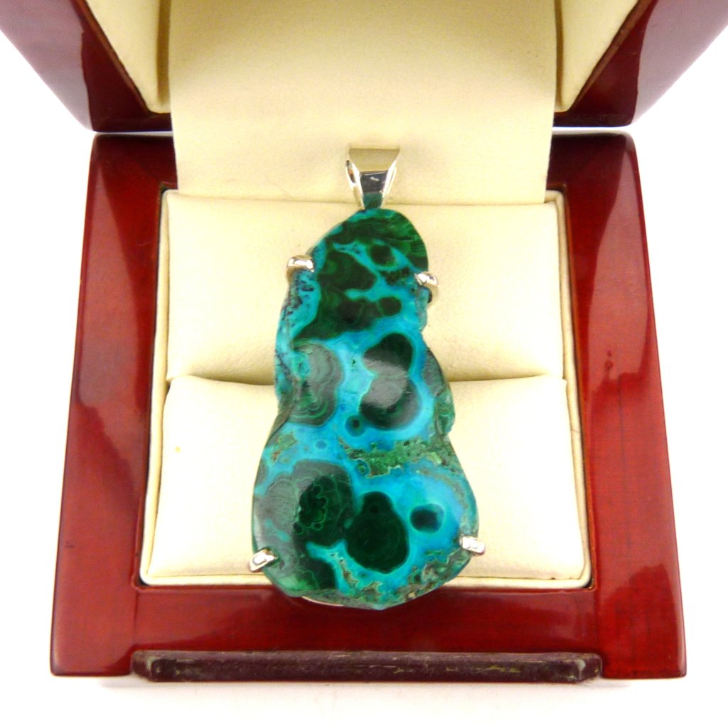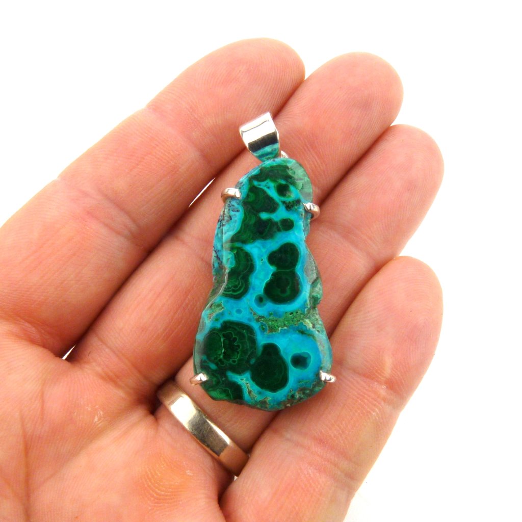 Přívěsek Ag 925/1000 krásného leštěného kamene Malachitu s Chryzokolem.