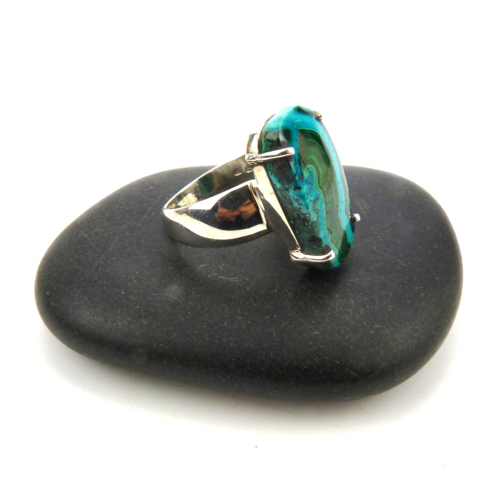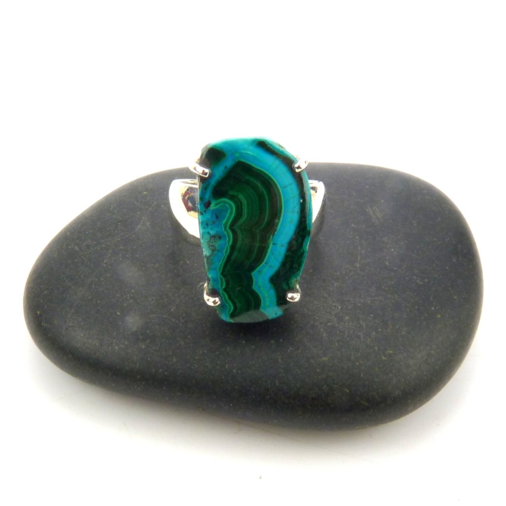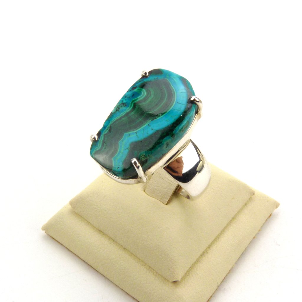 Prsten ve stříbře Ag 925/1000 krásného leštěného kamene Malachitu s Chryzokolem.