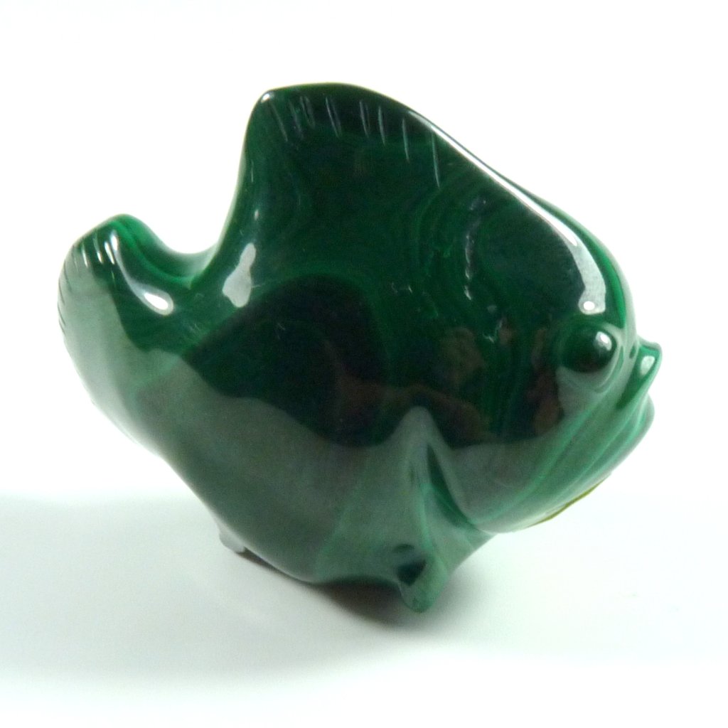 Malachit vybroušený do tvaru ryby, vhodné jako doplněk do interiéru.