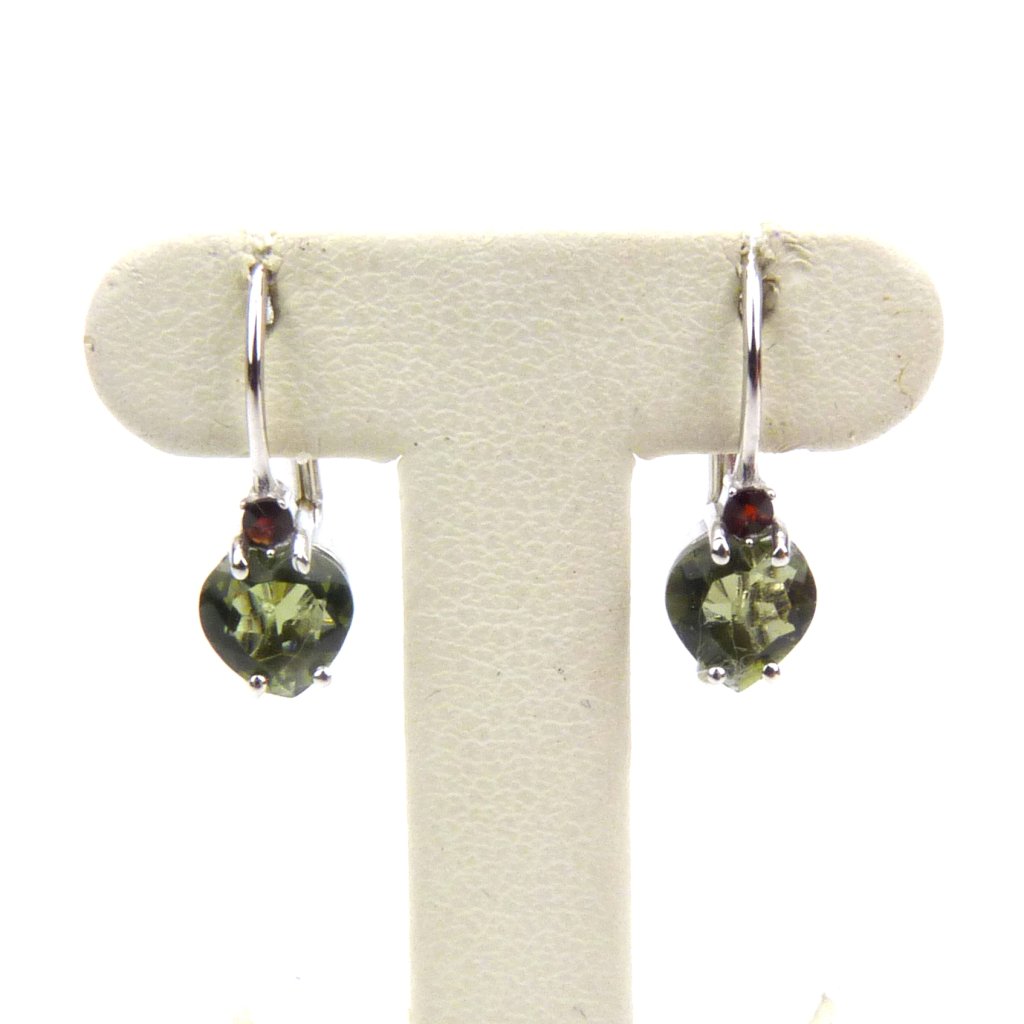 Broušený fazetovaný kámen vltavínu tvaru srdíčka o rozměru 6*6 mm a granátku 2 mm.