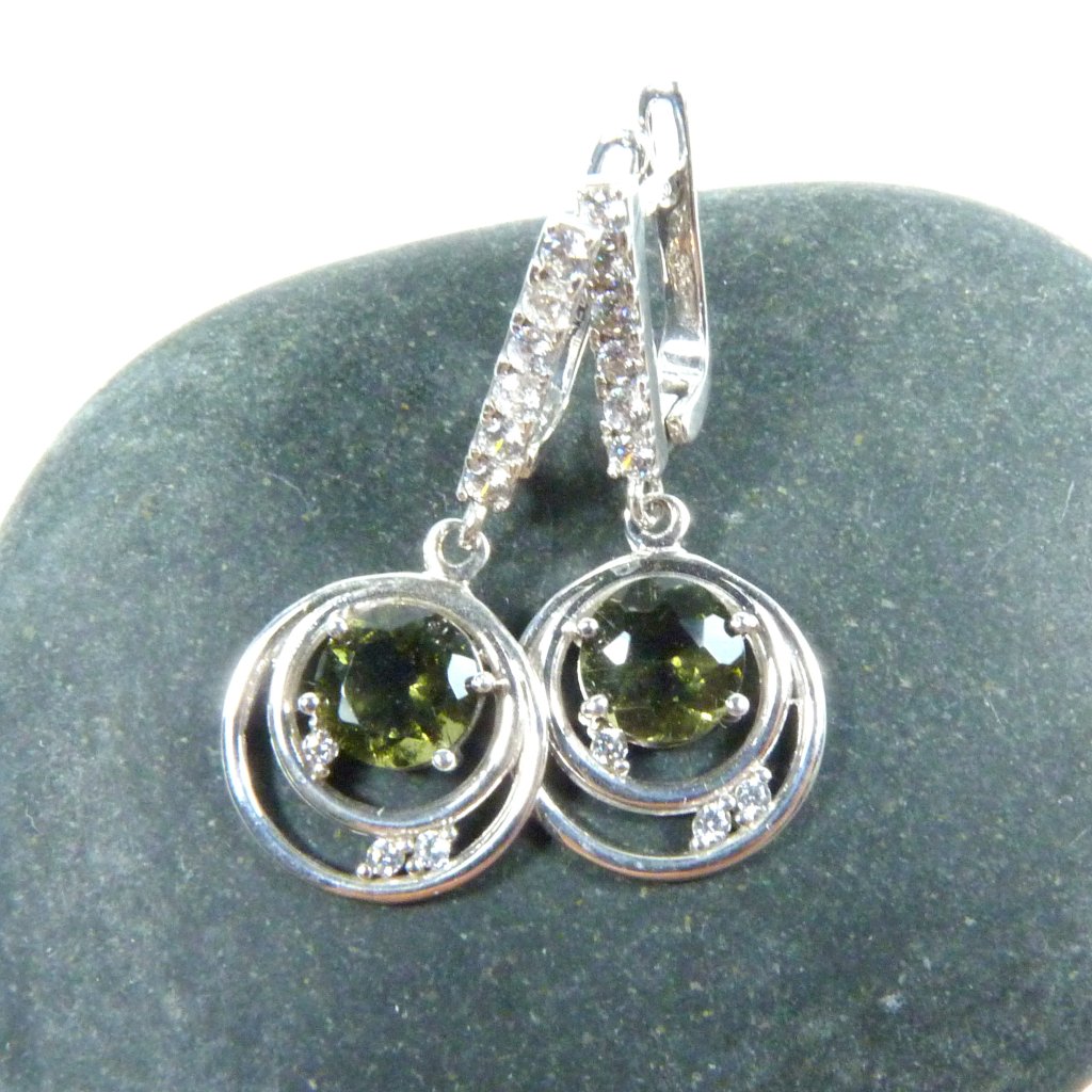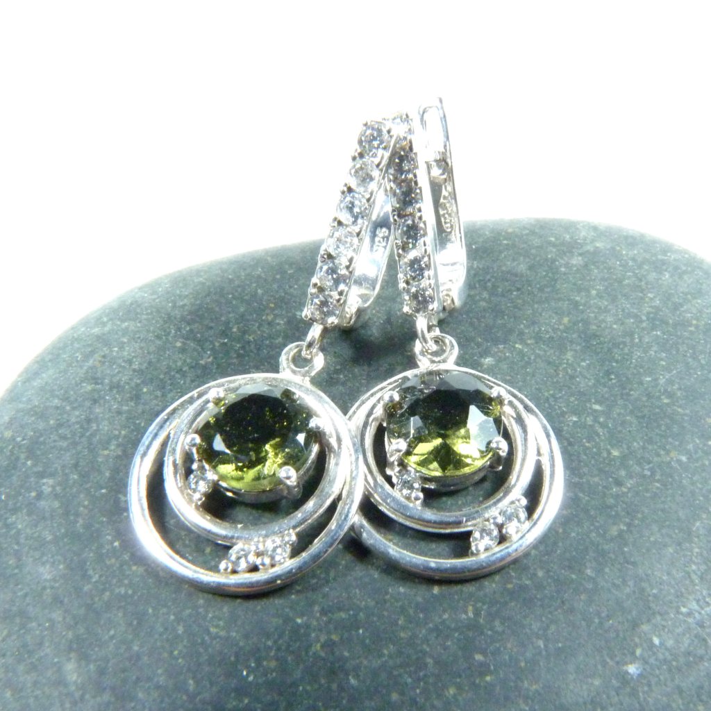 Vltavínové náušnice visací moderního tvaru se zirkony ve stříbře Ag 925/1000 Rhodium ( povrchová úprava šperku ).