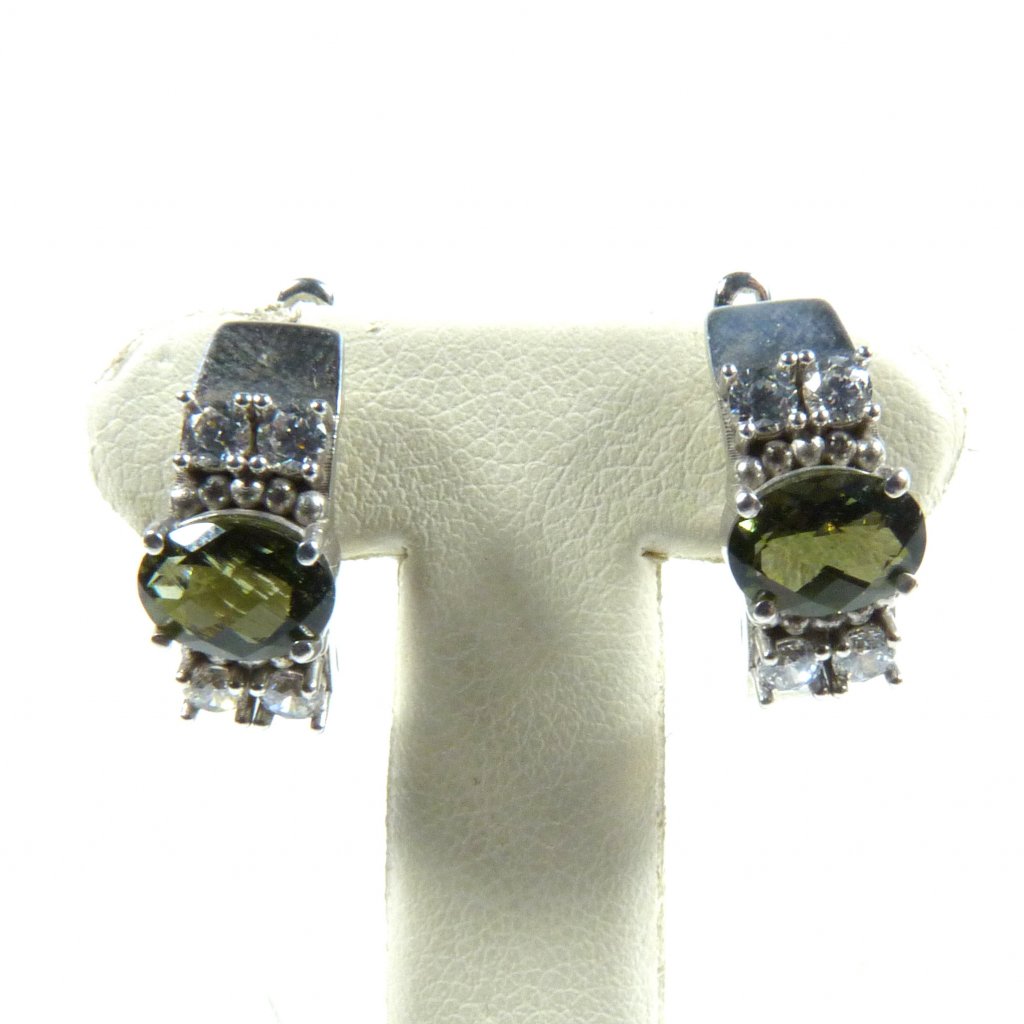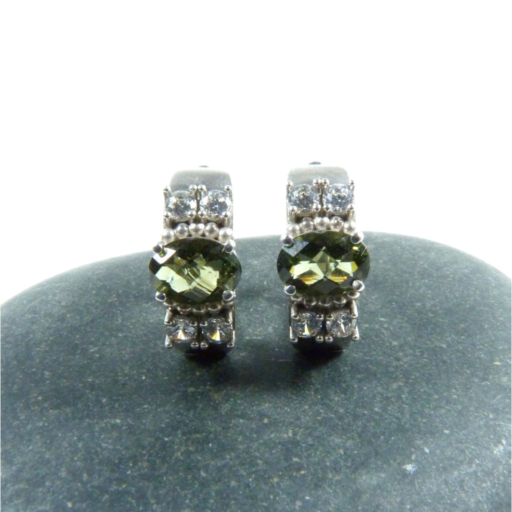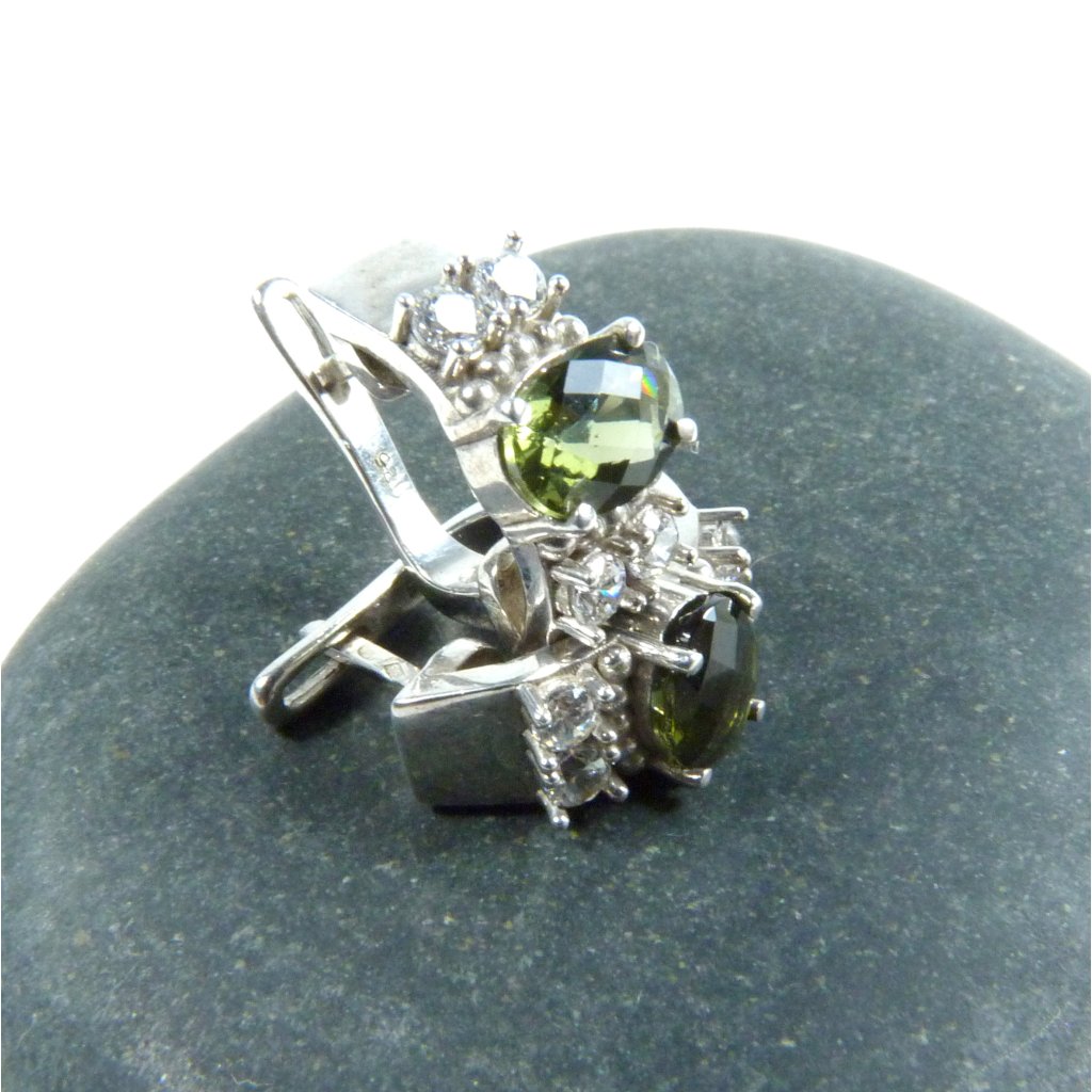 Vltavínové náušnice moderního tvaru se zirkony ve stříbře Ag 925/1000 Rhodium ( povrchová úprava šperku ).