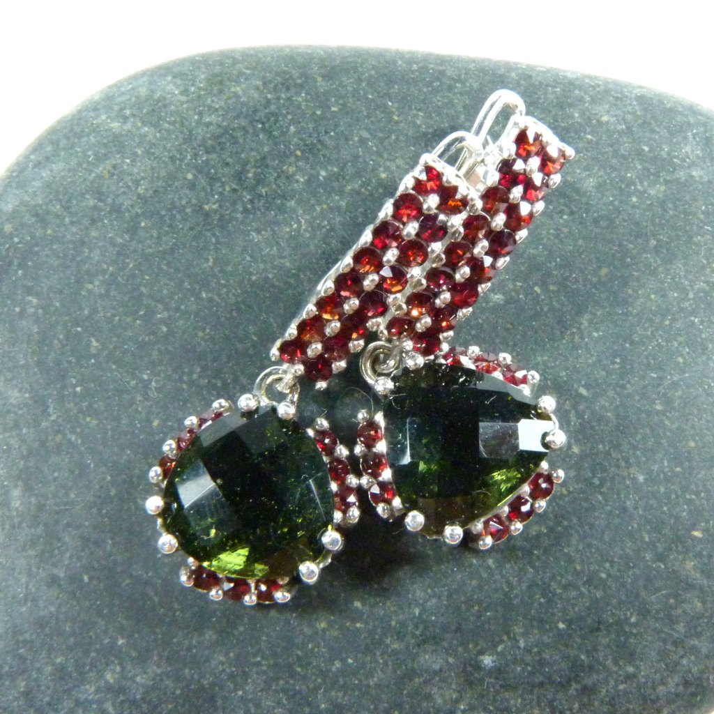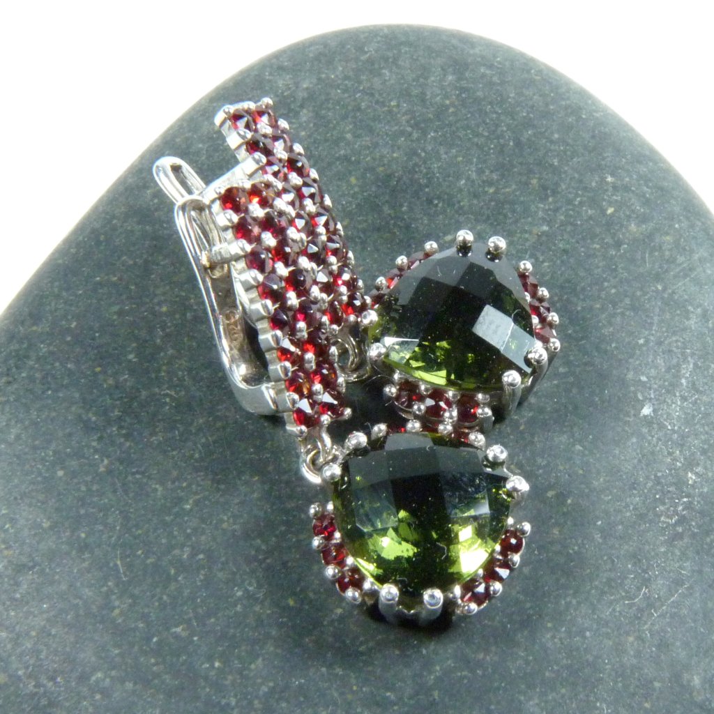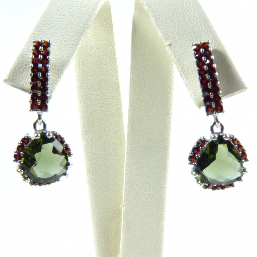 Exluzivní vltavínové náušnice visací moderního tvaru s granátem ve stříbře Ag 925/1000 Rhodium ( povrchová úprava šperku ).