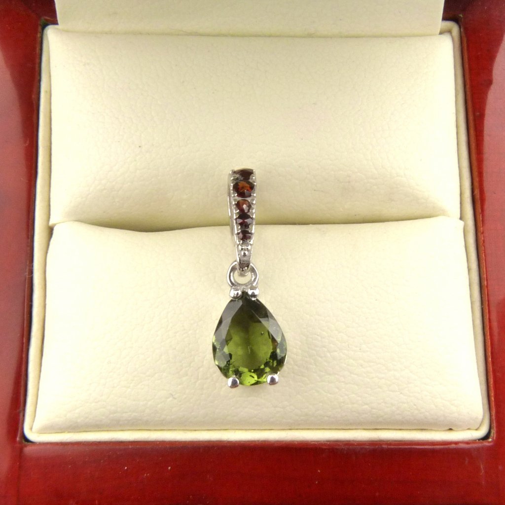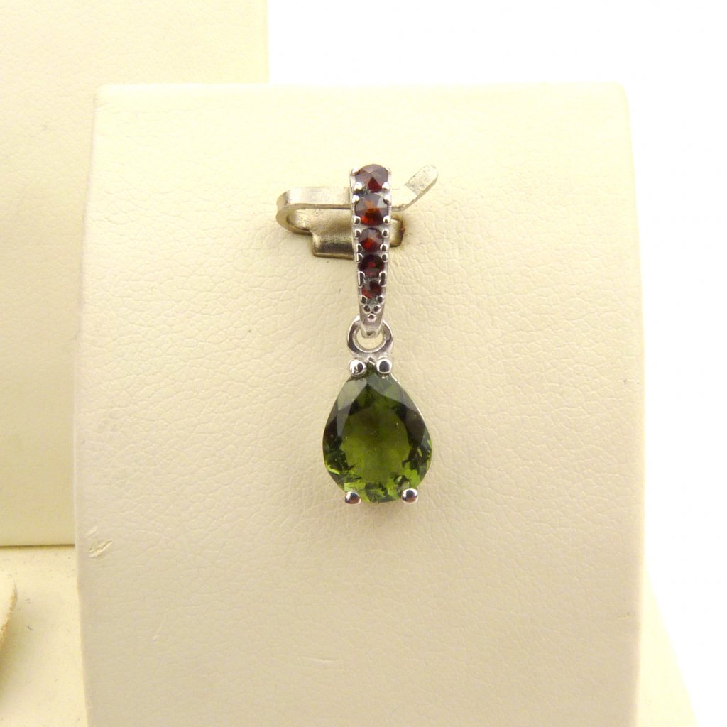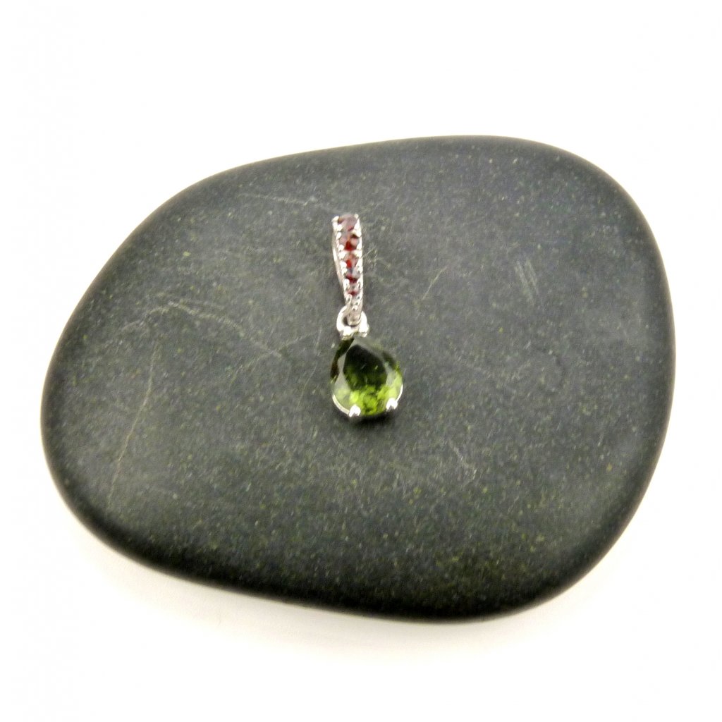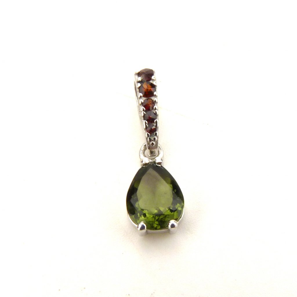 Vltavínový přívěsek ve stříbře s granáty Ag 925/1000 Rhodium (povrchová úprava šperku).