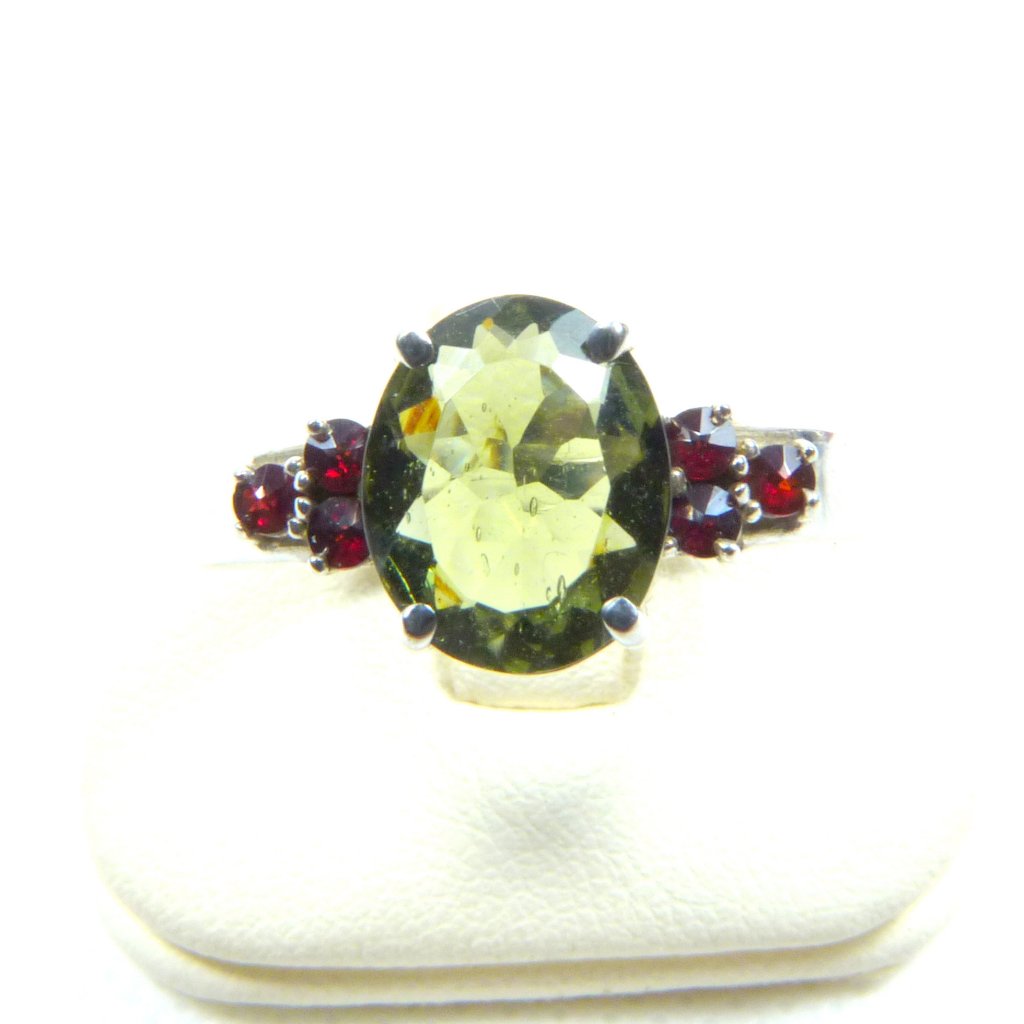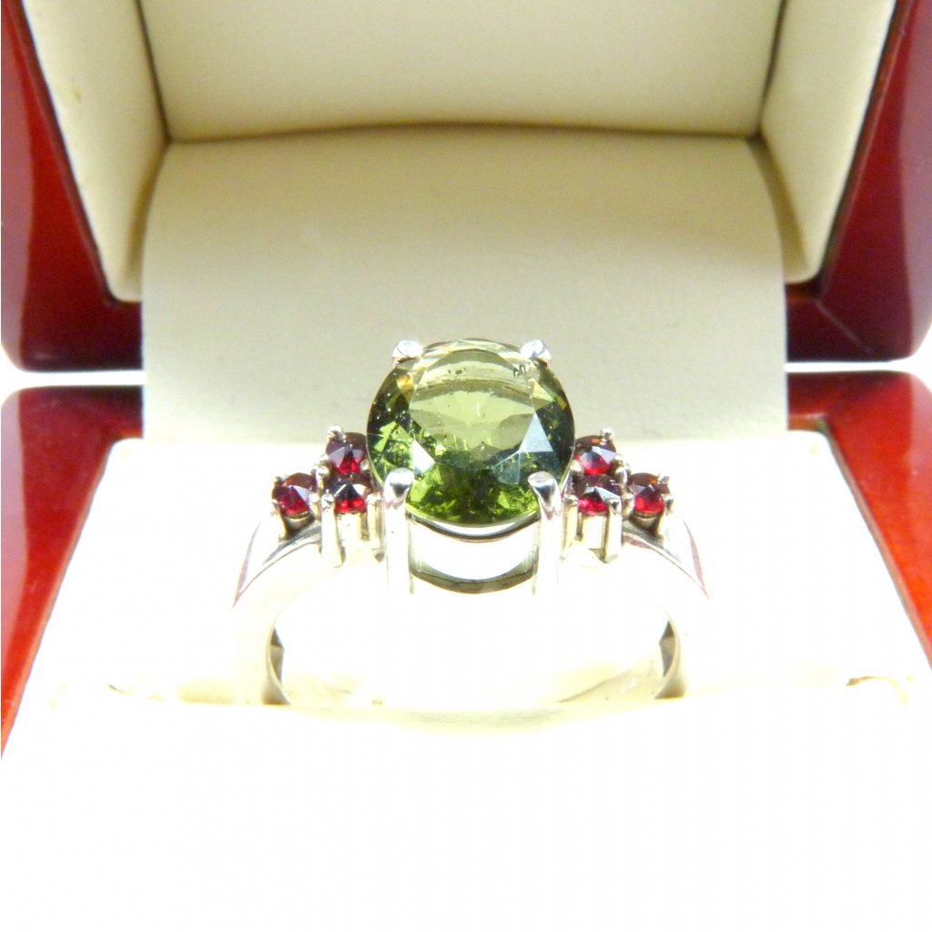 Vltavínový prsten s granátem ve stříbře Ag 925/1000 Rhodium ( povrchová úprava šperku ).