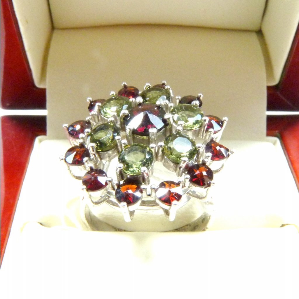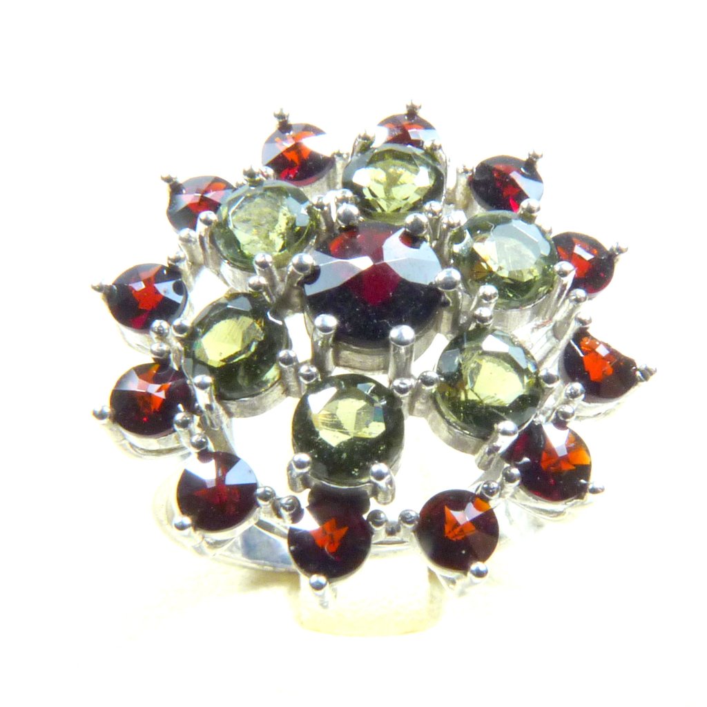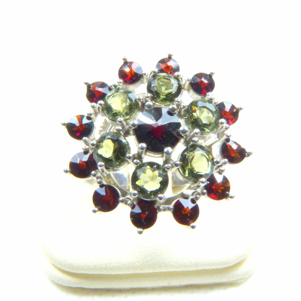 Vltavínový prsten kytička s granátem ve stříbře Ag 925/1000 Rhodium ( povrchová úprava šperku ).