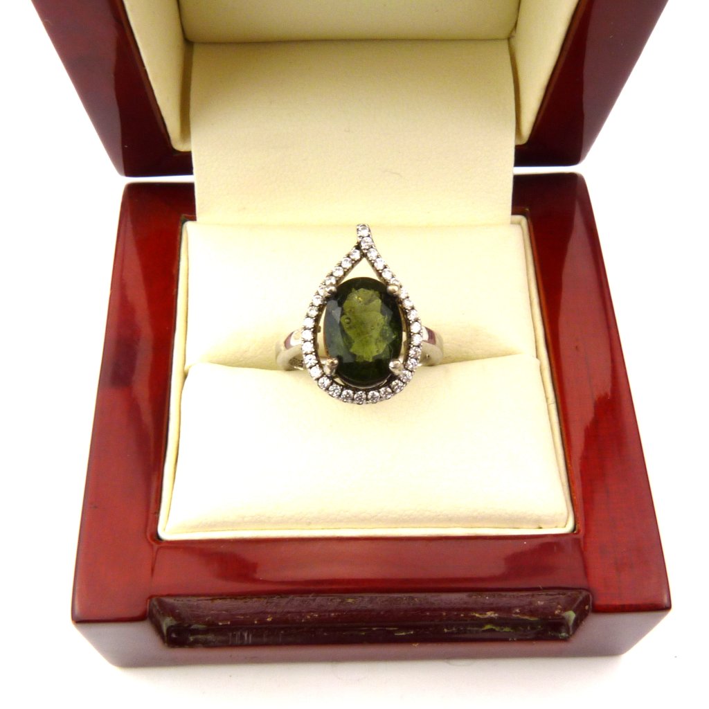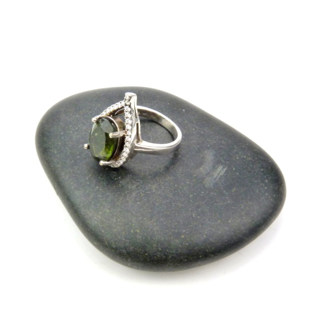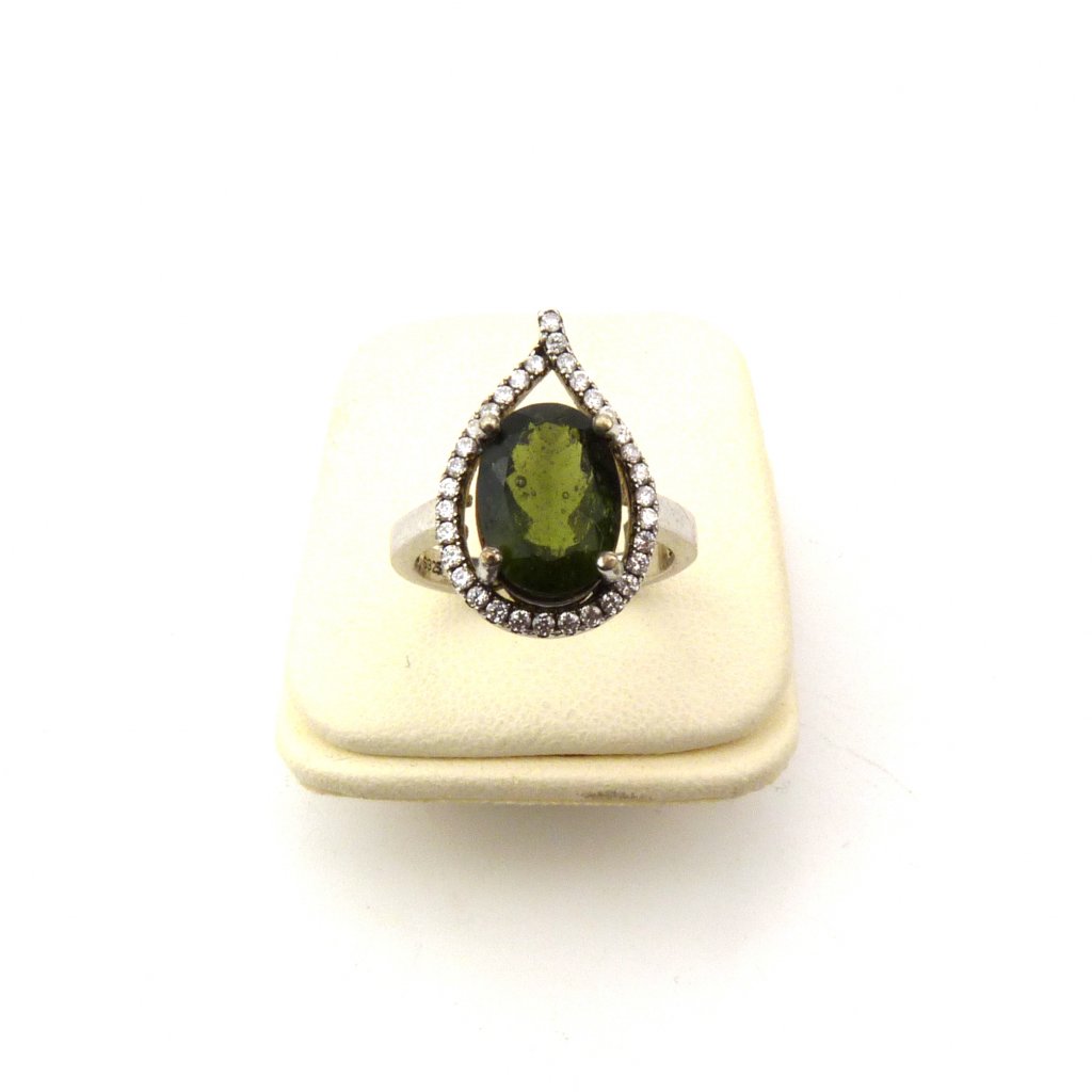 Vltavínový prsten se zirkony ve stříbře Ag 925/1000 Rhodium ( povrchová úprava šperku ).